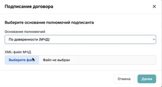 Необходимо прикрепить файл МЧД версии 003 в формате xml, нажав на кнопку «Выберите файл». После прикрепления файла нажать «Далее»;