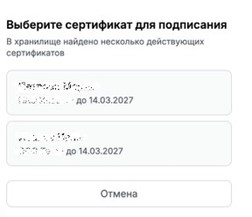 - Нажимите «Подписать КЭП». Выберите сертификат для подписания: