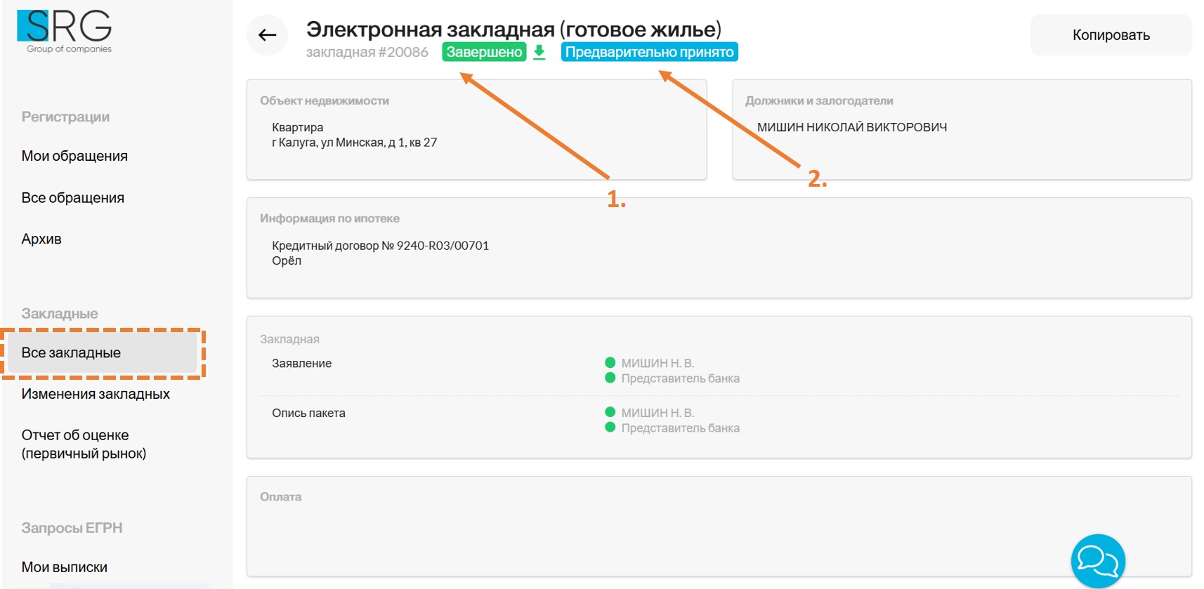 Внутри самой закладной вы можете видеть технический статус формирования пакета закладной (1) и информационный статус депозитария на первом этапе рассмотрения закладной (2).