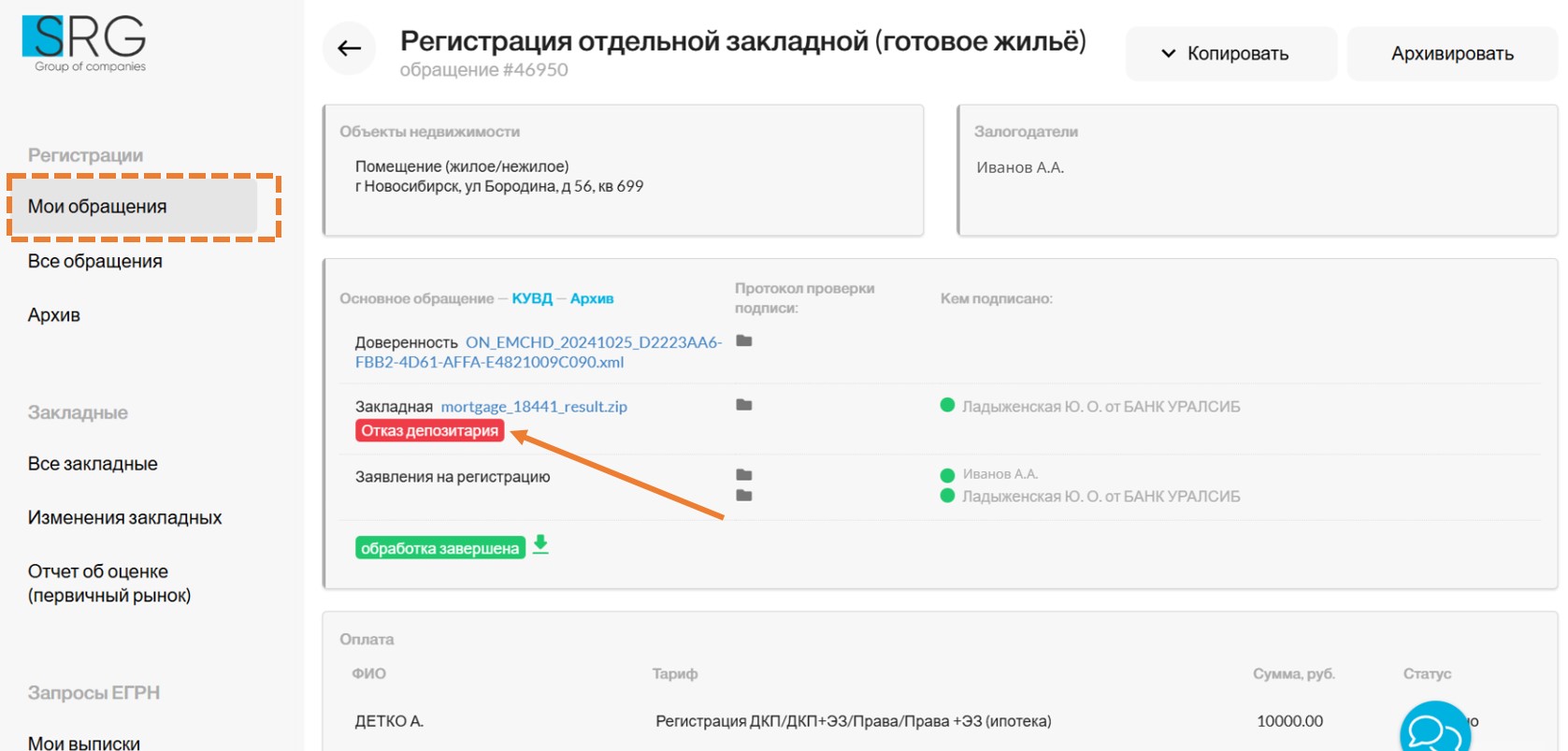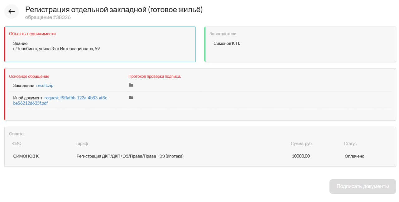 Внутри Обращения, содержащего закладную, также отображается статус депозитария.